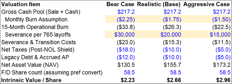 Finally, the Debt and AP lines assumes the retirement of the remaining $12M in senior debt and the settlement of trade payables. If management confirms a path to a special dividend at the upcoming December 30 Annual Meeting, the discount to value should evaporate, and the stock will likely gravitate toward the top end of my range.